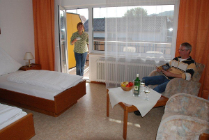 Unser Haus bietet Ihnen 11 Übernachtungsmöglichkeiten. Es stehen 3 Einzelzimmer (Du/Wc) 2 Doppelzimmer (Du/Wc,Balkon) sowie ein 2 Zimmerapartment (Wanne/Wc,Balkon) für bis zu 4 Personen zur Verfügung. Alle Zimmer sind mit Fernseher mit Satellitenempfang und kostenlosem WLAN ausgestattet. Weiterhin haben wir ausreichend Parkplätze für Pkw. Parkmöglichkeiten für Busse und LKW stehen ebenfalls zur Verfügung.
